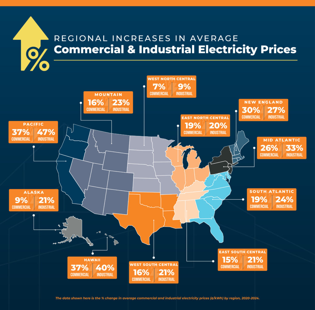The short answer: Energy costs are rising in most regions across the U.S. According to data from the U.S. Energy Information Administration, the average price of electricity has increased by nearly 21% for commercial customers and about 18% for industrial customers over the last decade.