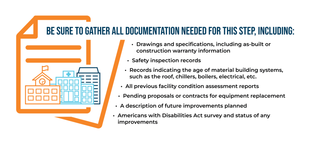 In order to tackle your deferred maintenance issues and prioritize facility improvements, it’s critical to first understand the current state of your building’s conditions. A facility condition assessment analyzes a building’s condition as it relates to its age, design, construction methods, and systems. Typically conducted by a facility condition assessment specialized service provider, they include a review of documentation related to a building’s original construction, any renovations, and a physical site walkthrough to ensure the accuracy of as-built or as-is conditions. Be sure to gather all documentation needed for this step, including: