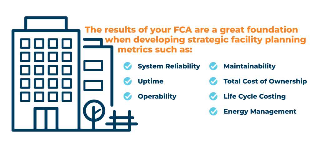 The results of your FCA are a great foundation when developing strategic facility planning metrics such as system reliability, uptime, operability, maintainability, the total cost of ownership, life cycle costing, and energy management. These metrics help determine the remaining useful life of various components or systems and compare it with full economic life expectancies, given good maintenance practices. With this information in hand, you can identify facility improvement projects as well as establish a timeline and an estimated cost to replace.