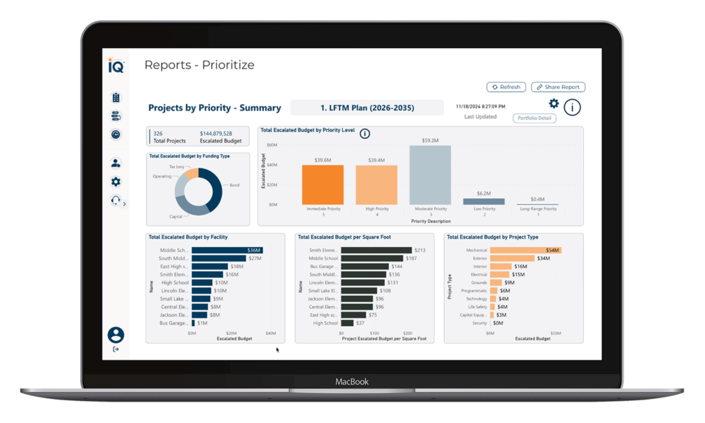 With mySiteIQ Prioritize, a part of our technology-enabled facility intelligence platform, you can gain visibility into your facilities to help you plan effectively and maximize return on capital investments. Your team will be able to readily construct and compare different project scenarios for long-range master facility planning and advanced prioritization of your facility improvements.