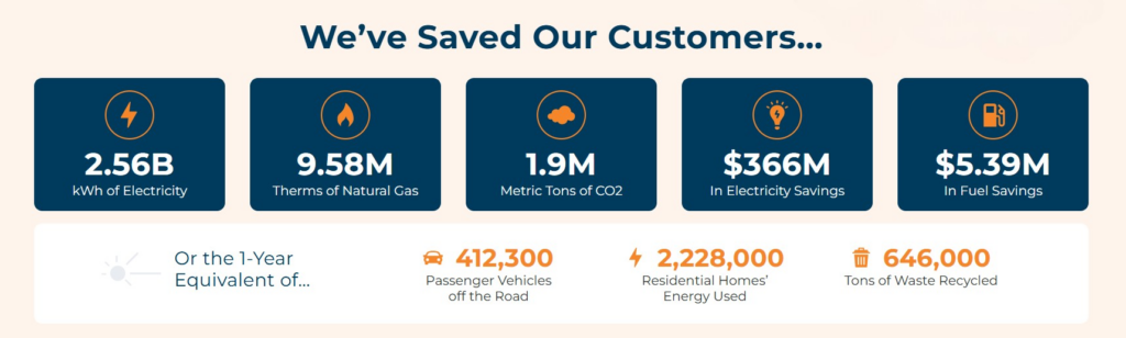 We’ve saved our customers a total of 2.56 billion kWh of electricity, 9.58 million therms of natural gas, and 1.9 million metric tons of CO2 – or the 1-year equivalent of 412,300 passenger vehicles off the road, 2,228,000 residential homes’ energy use, and 646,000 tons of waste recycled. While our energy experts have countless stories about how we’ve helped customers make meaningful changes to their spaces, they all share the same goal – to make buildings and the planet better for our communities.