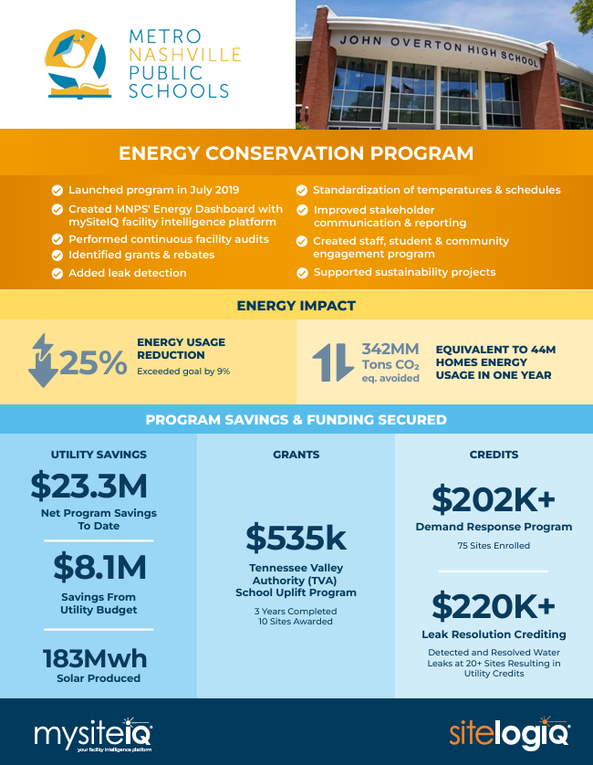 In 2019, Metro Nashville Public Schools (MNPS) partnered with SitelogIQ to launch an energy conservation program supported by mySiteIQ. Together, the district serving over 80,000 students and the SIQ team worked to identify opportunities to optimize utility and energy costs while seeking (and winning) thousands in local grants.
