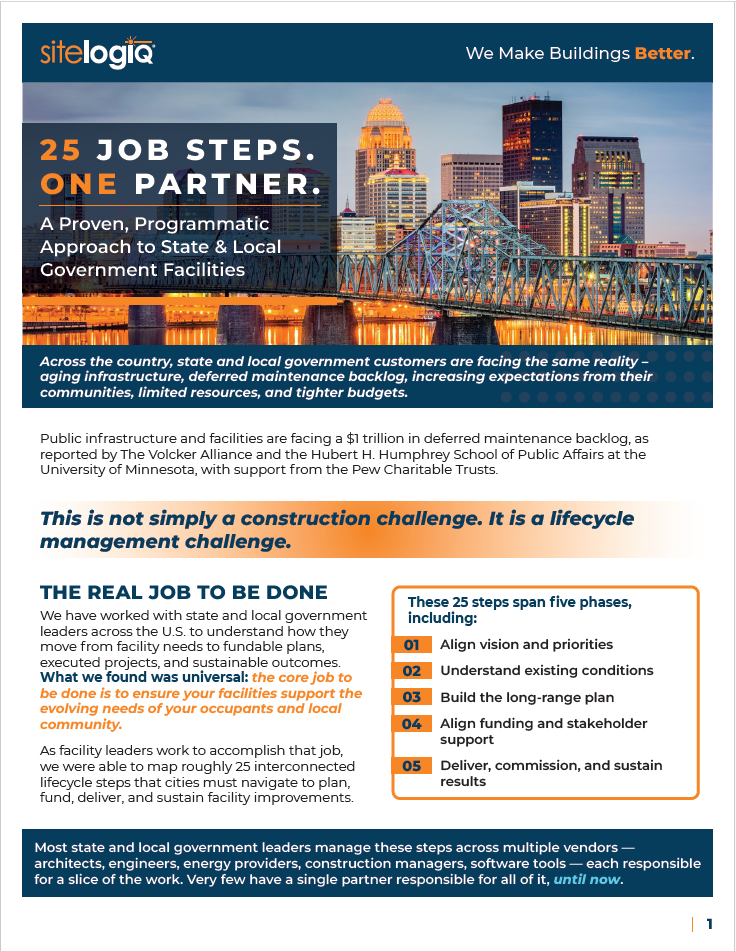 In this guide, we share a structured approach to long-term facility planning for state and local governments, addressing the growing challenges of aging infrastructure, deferred maintenance, and limited budgets. We outline 25 critical steps that move organizations from understanding present facility conditions to building fundable plans, executing projects, and sustaining results.